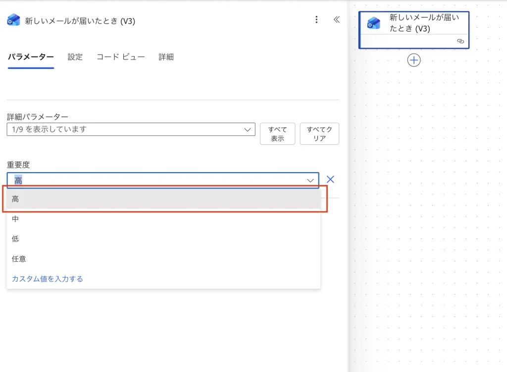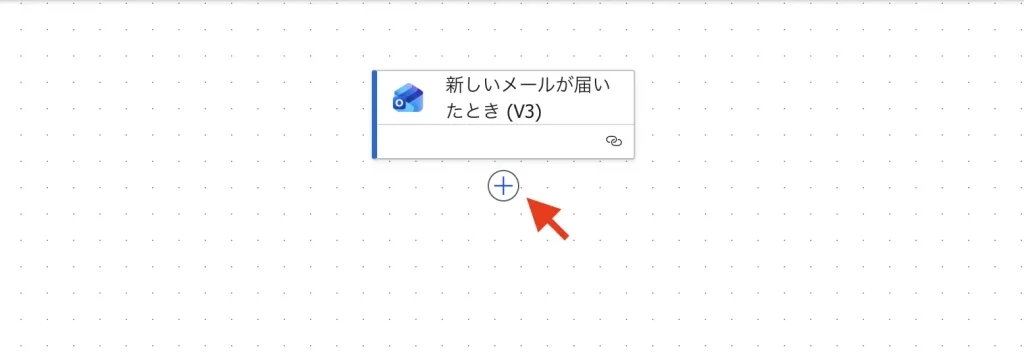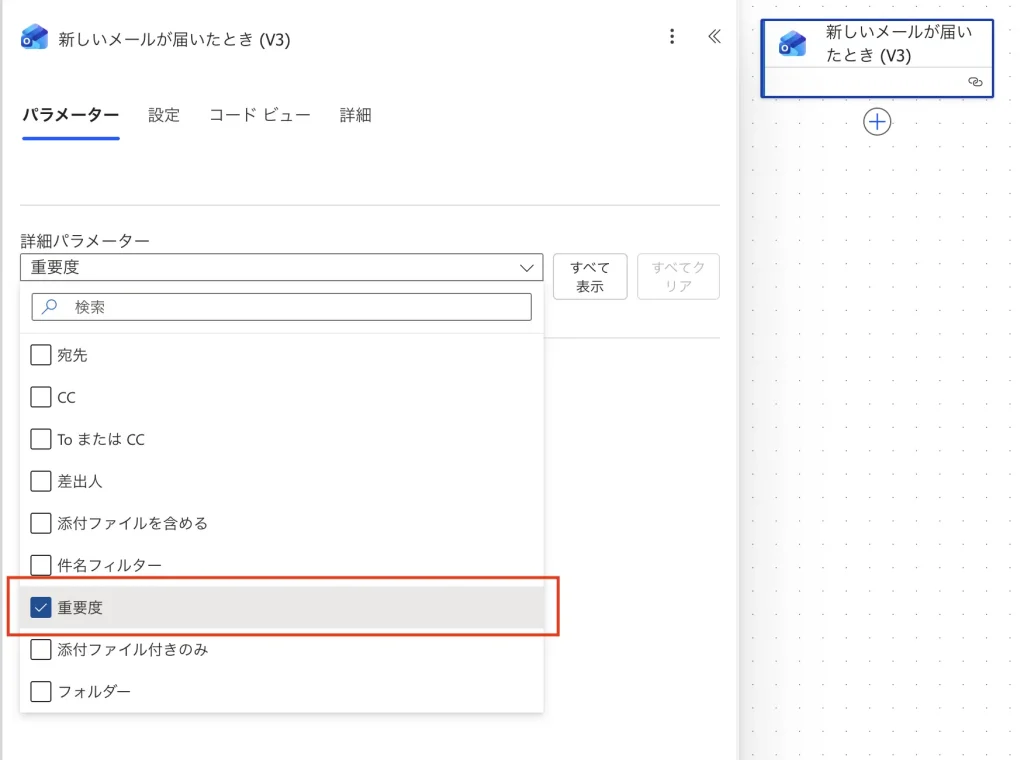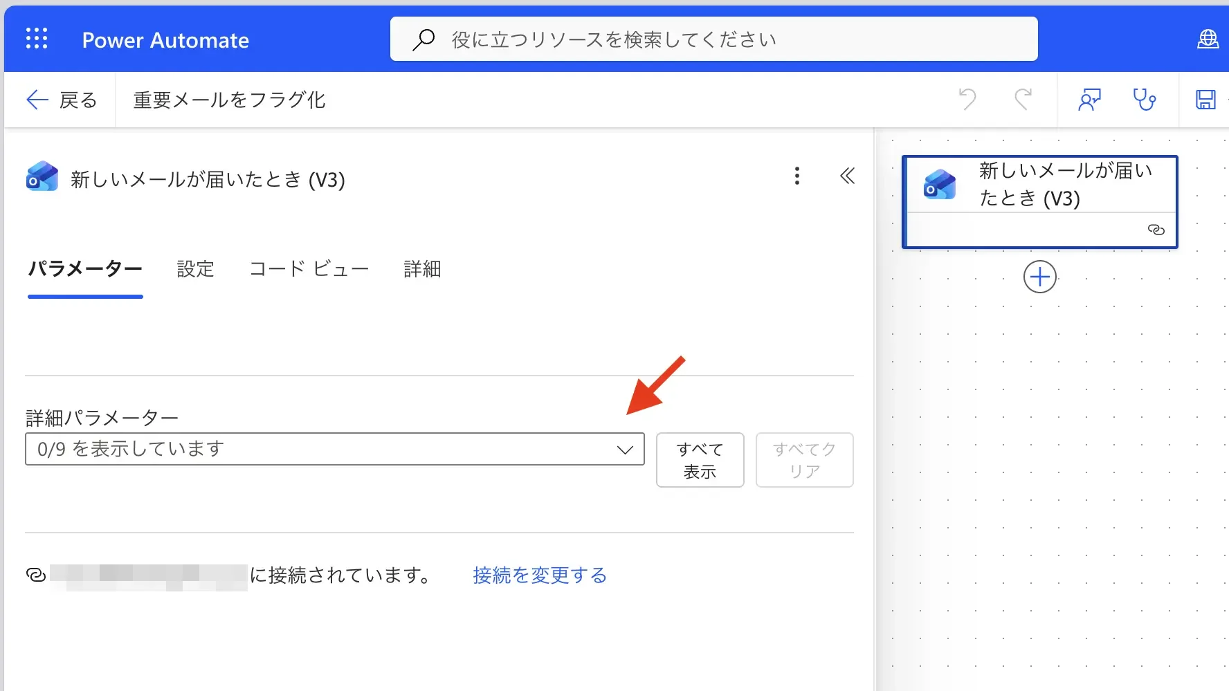 フロー編集画面で、一番上の「新しいメールが届いたとき (V3)」をクリックして設定パネルを開く。
