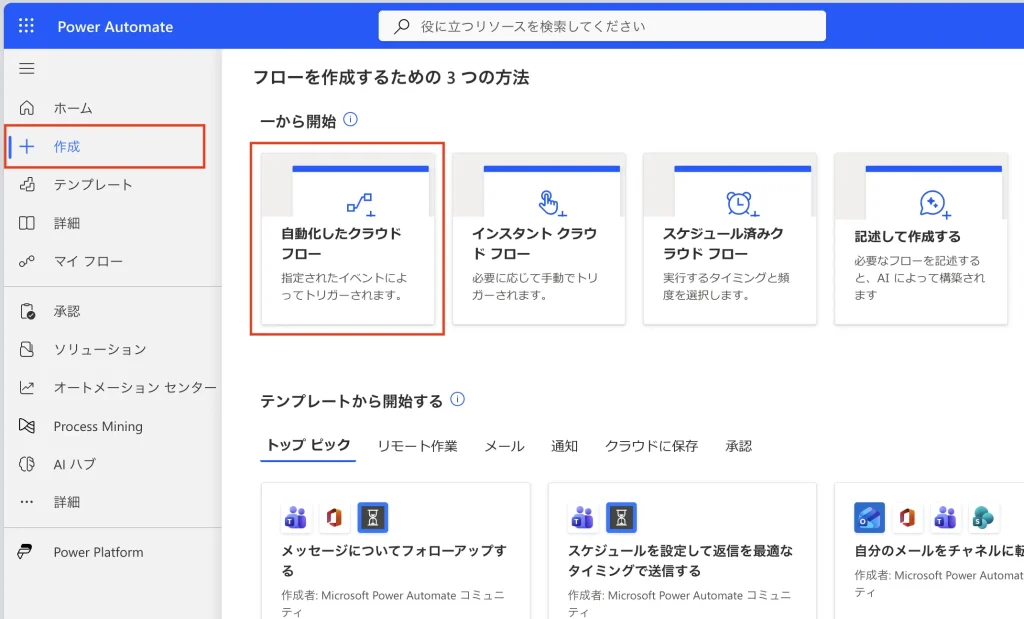 左メニュー「作成」>「自動化したクラウド フロー」を選択。