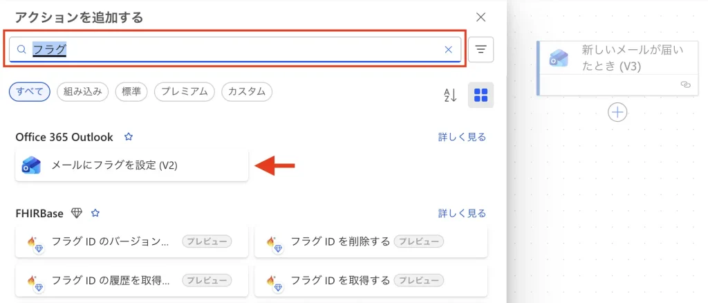検索窓に「フラグ」と入力し、「メールのフラグを設定 (V2)」を選択。