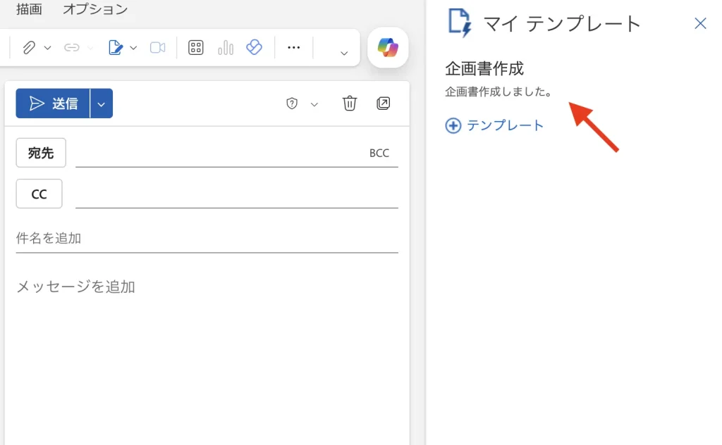 右側のパネルにマイテンプレート「企画書作成」が表示されています。